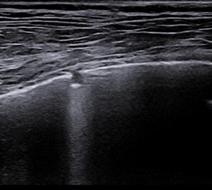 | Ausencia de deslizamiento | Línea pleural estática; no hay movimiento de "vaivén" con la respiración. | Separación de las pleuras parietal y visceral por aire. | Neumotórax. Se busca en las zonas más altas (no dependientes) del tórax. |